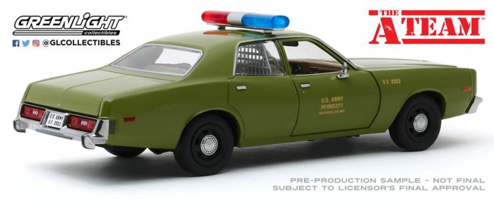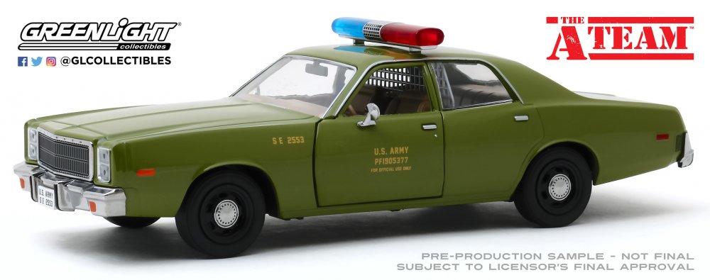 Aus der TV Serie The A-Team der 1977 Plymouth Fury der US Army von Greenlight mit Echt Gummi-Reifen.